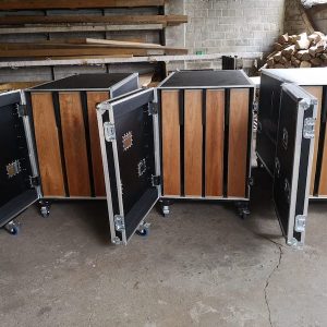 Als heavy-duty Boxen aus beschichtetem Holz, sind unsere Flight Cases mit Kantenschutz, Beschlägen und Guitelrollen versehen und optimiert für den Transport von bis zu sechs Podesten.